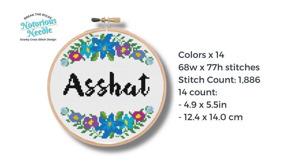 "Asshat" written in bold, black script font surrounded by a blue floral wreath cross stitch pattern PDF instant download. Fits perfectly inside a 6-inch embroidery hoop when cross stitched on 14ct fabric.