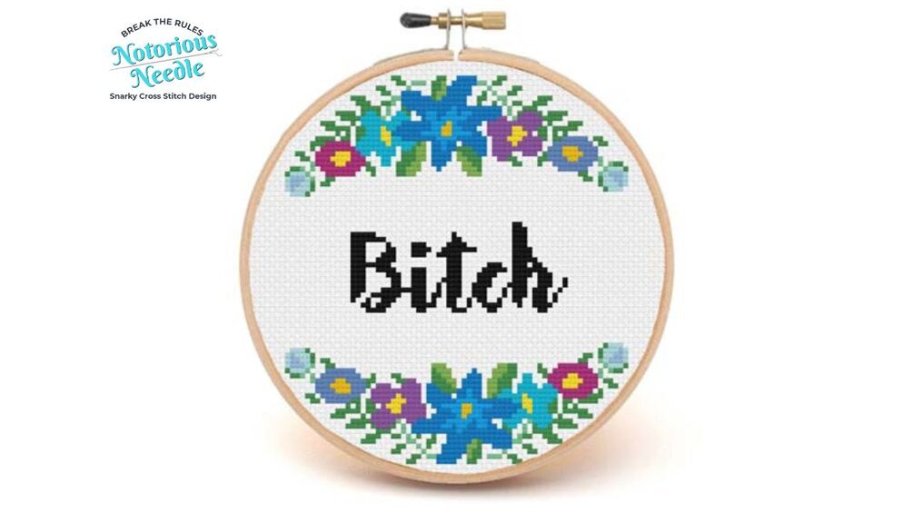 "Bitch" is written in bold, black script font surrounded by a blue floral wreath cross stitch pattern PDF instant download. Fits perfectly inside a 6-inch embroidery hoop when cross stitched on 14ct fabric.