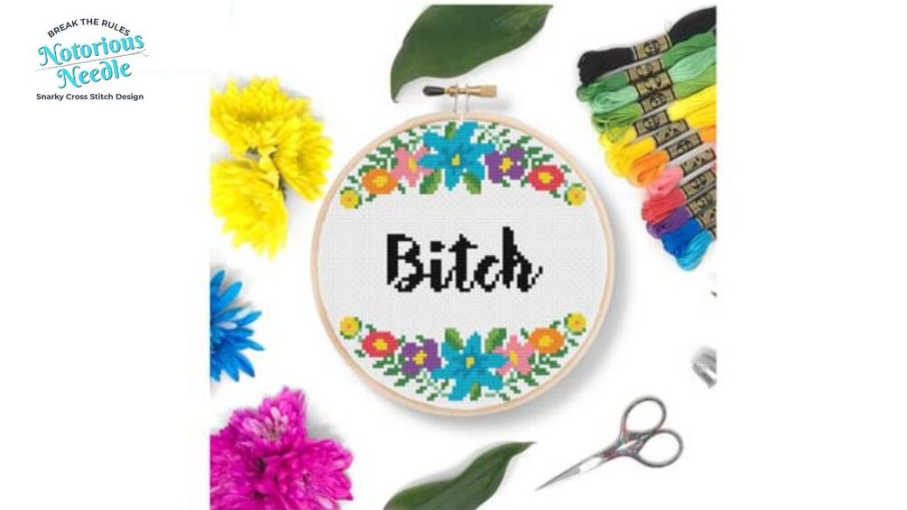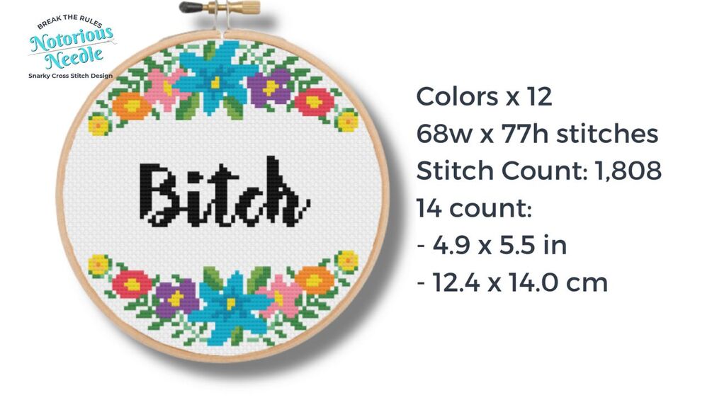 "Bitch" is written in bold, black script font surrounded by a multi-color floral wreath cross stitch pattern PDF instant download. Fits perfectly inside a 6-inch embroidery hoop when cross stitched on 14ct fabric.