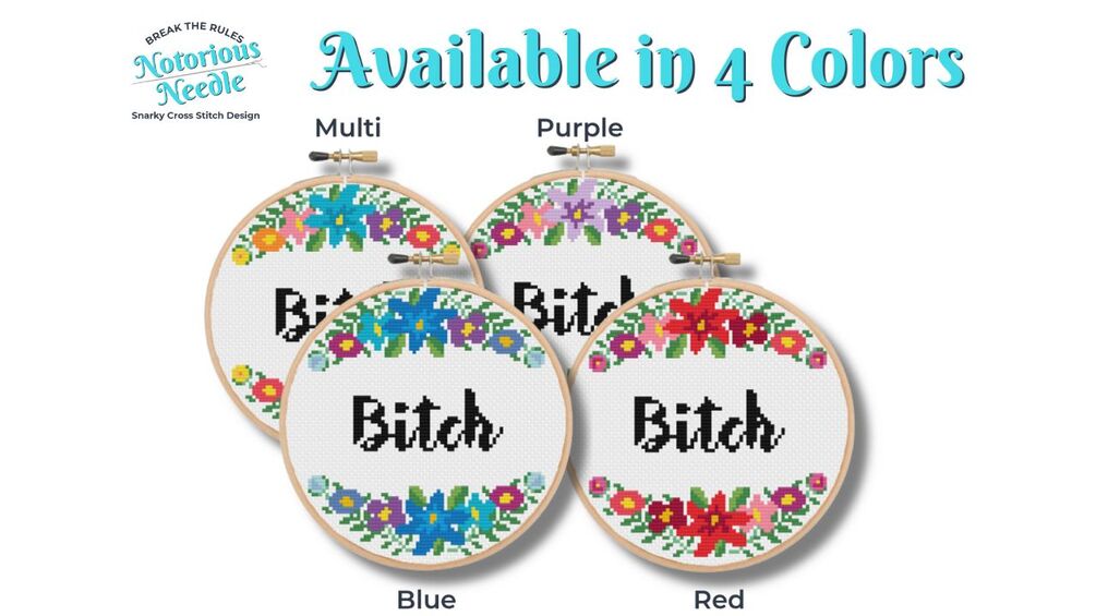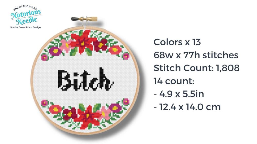 "Bitch" is written in bold, black script font surrounded by a red floral wreath cross stitch pattern PDF instant download. Fits perfectly inside a 6-inch embroidery hoop when cross stitched on 14ct fabric.