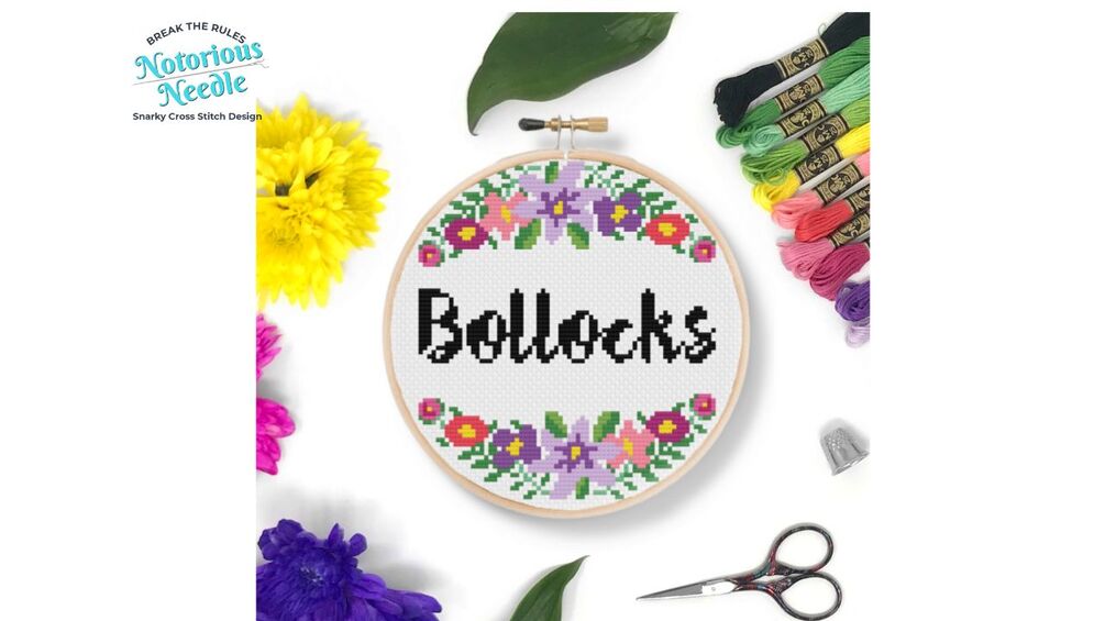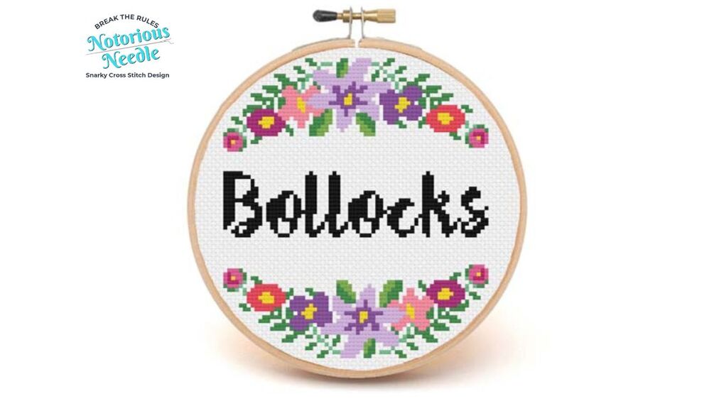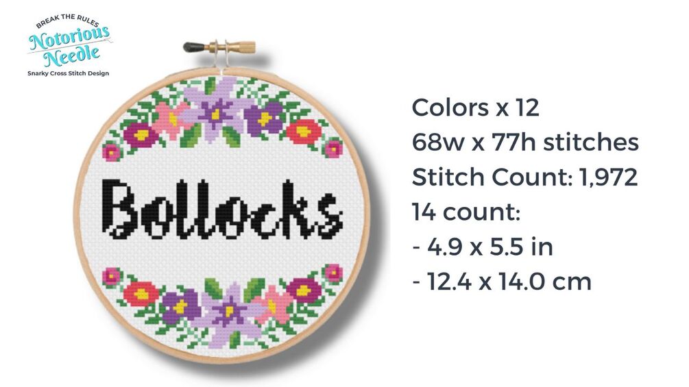 "Bollocks" is written in bold, black script font surrounded by a purple floral wreath cross stitch pattern PDF instant download. Fits perfectly inside a 6-inch embroidery hoop when cross stitched on 14ct fabric.