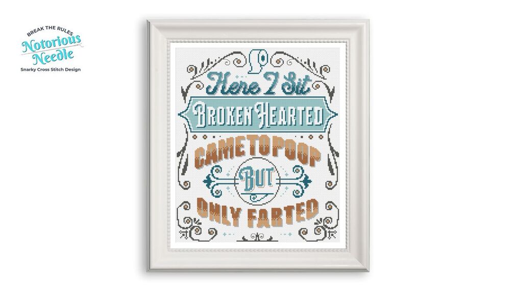 A childhood limerick come to life! Poop jokes never get old. Laugh it up with this cheeky cross stitch pattern featuring soft, blues and browns and vintage style lettering. The elegant beauty of the delicate borders juxtaposed with the rude poem is sure to spark laughter in every guest who spies it in your bathroom or toilet.