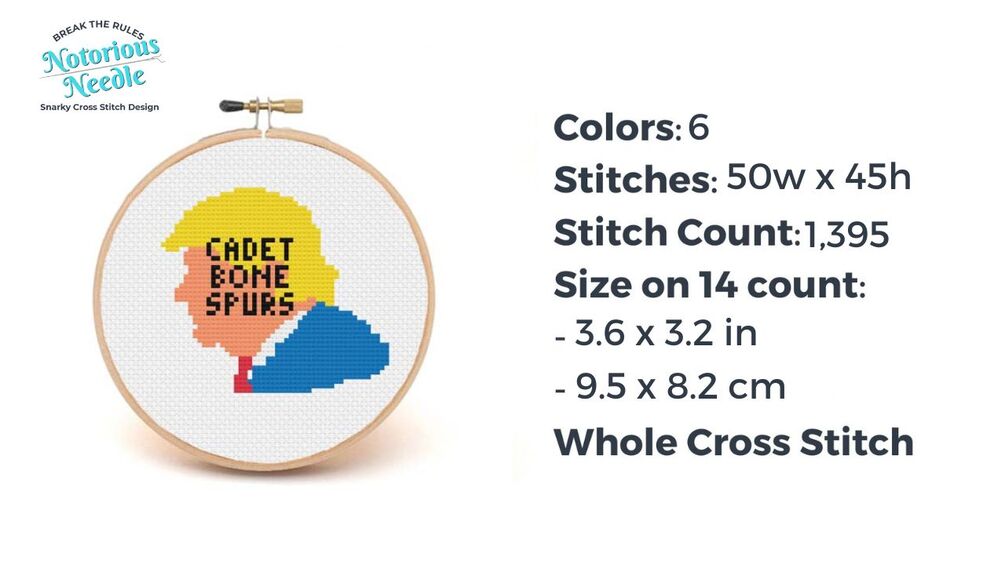 Cadet Bone Spurs was inspired by the fact that Donald Trump dodged the draft 5 times, at least once with a medical letter (falsely) claiming he had bone spurs and couldn’t serve. This is one of 6 patterns, and each nickname is inspired by Trump’s own disgusting behavior. Stitch it on a smaller count and it could be made into a button! RESIST!