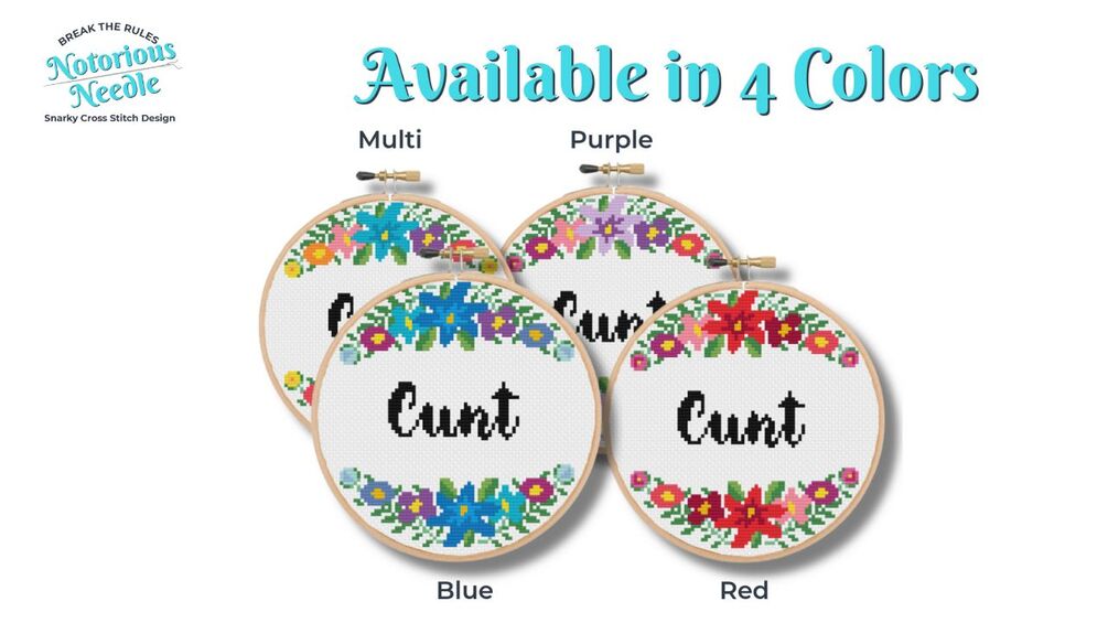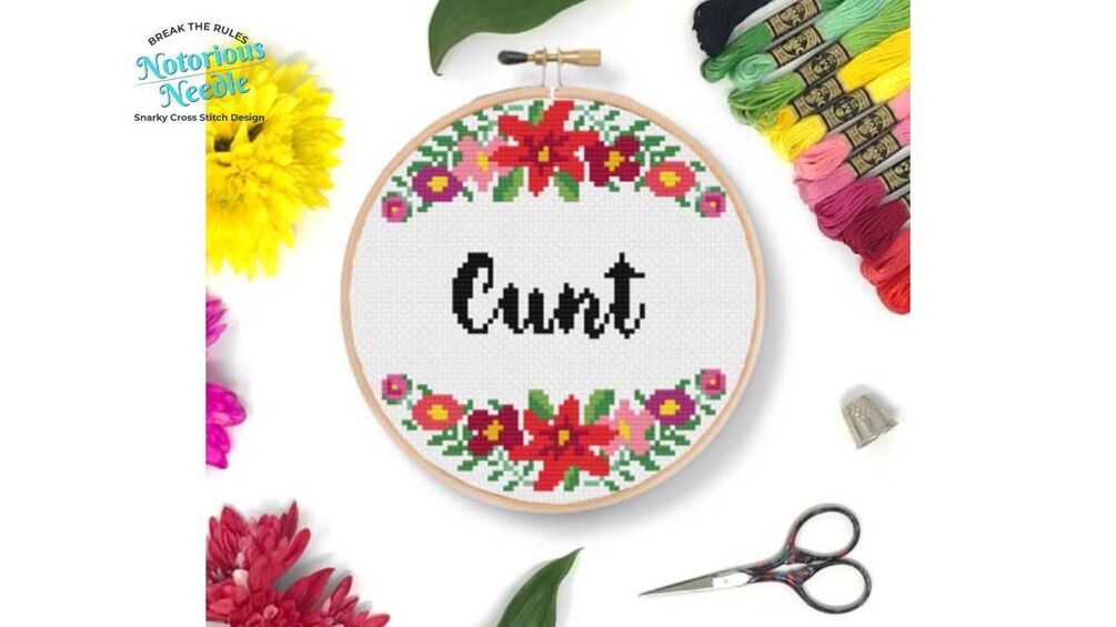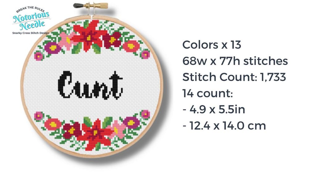 "Cunt" is written in bold, black script font surrounded by a red floral wreath cross stitch pattern PDF instant download. Fits perfectly inside a 6-inch embroidery hoop when cross stitched on 14ct fabric.