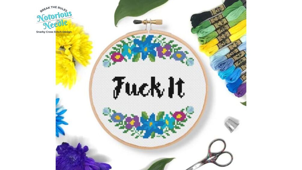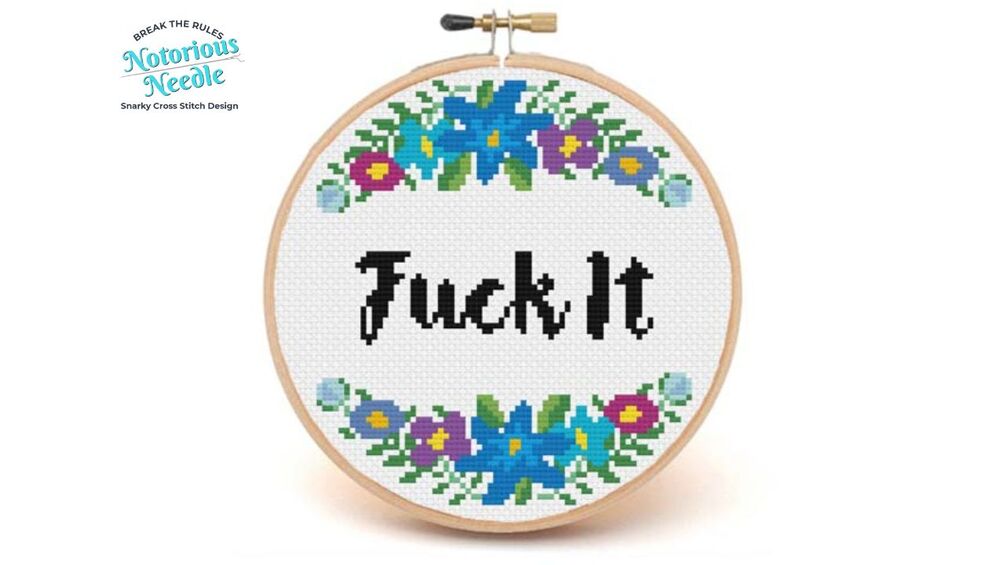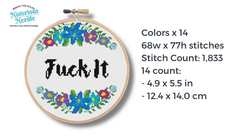 "Fuck It" is written in bold, black script font surrounded by a blue floral wreath cross stitch pattern PDF instant download. Fits perfectly inside a 6-inch embroidery hoop when cross stitched on 14ct fabric.