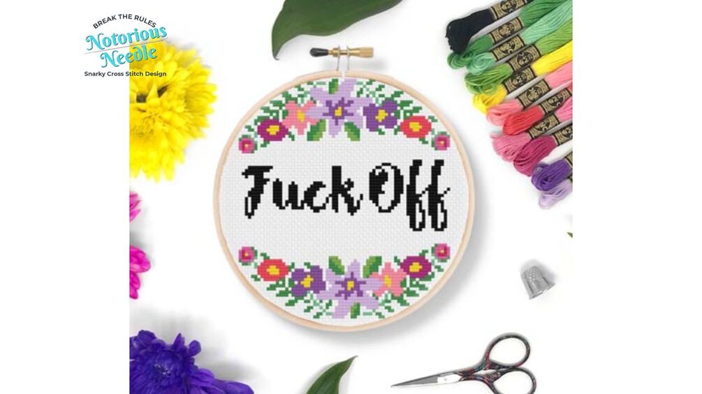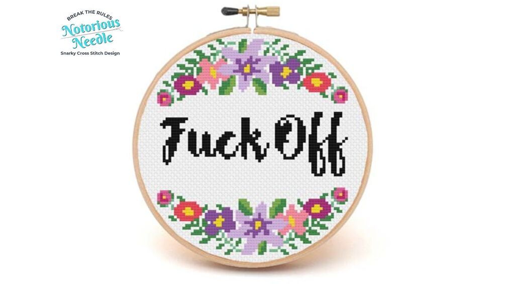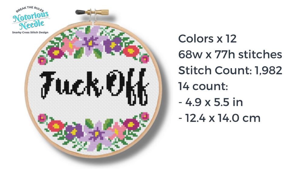"Fuck Off" is written in bold, black script font surrounded by a purple floral wreath cross stitch pattern PDF instant download. Fits perfectly inside a 6-inch embroidery hoop when cross stitched on 14ct fabric.