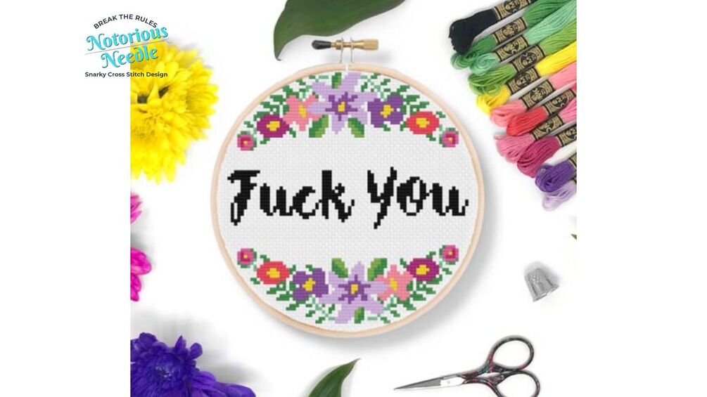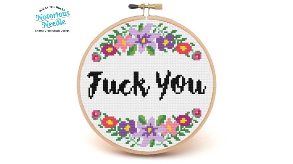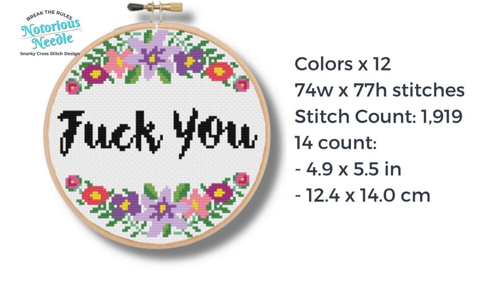 "Fuck You" is written in bold, black script font surrounded by a purple floral wreath cross stitch pattern PDF instant download. Fits perfectly inside a 6-inch embroidery hoop when cross stitched on 14ct fabric.