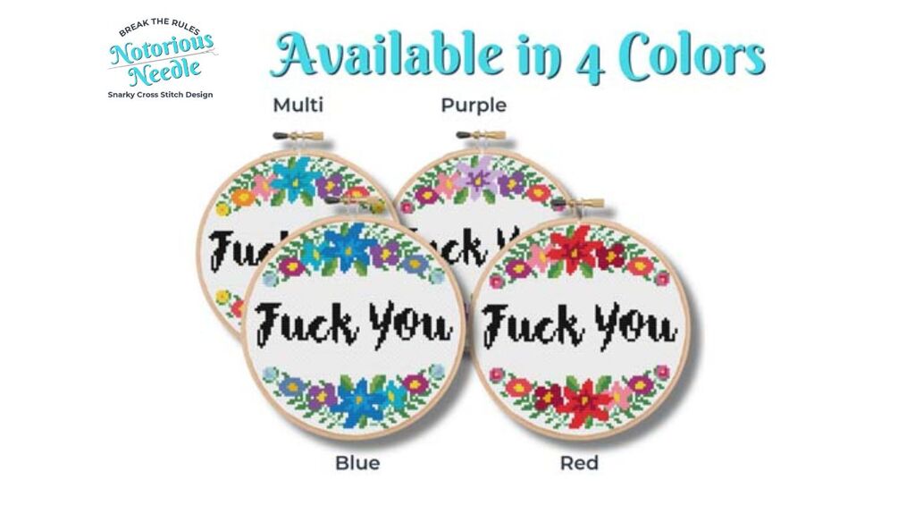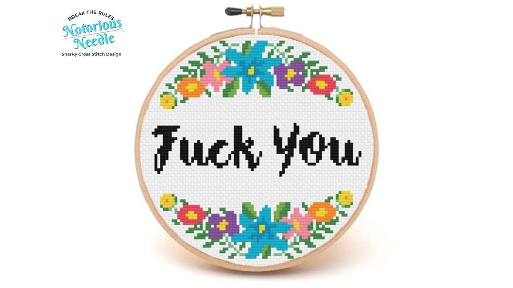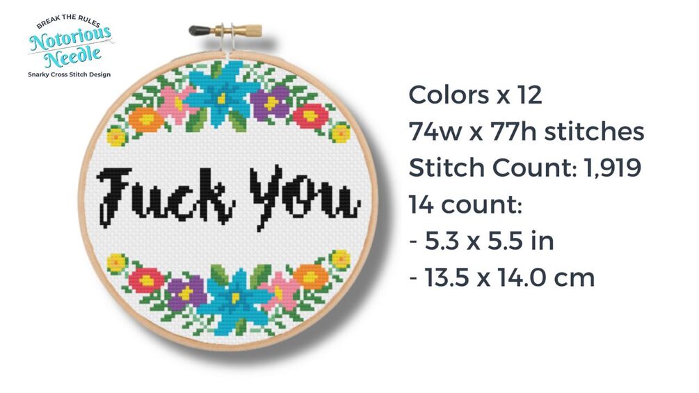 "Fuck You" is written in bold, black script font surrounded by a multi-color floral wreath cross stitch pattern PDF instant download. Fits perfectly inside a 6-inch embroidery hoop when cross stitched on 14ct fabric.