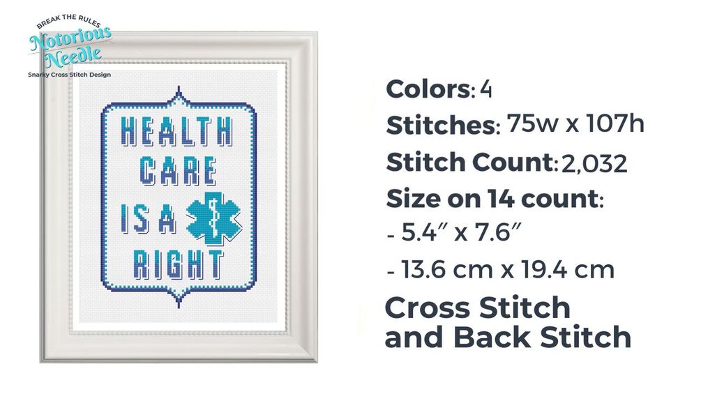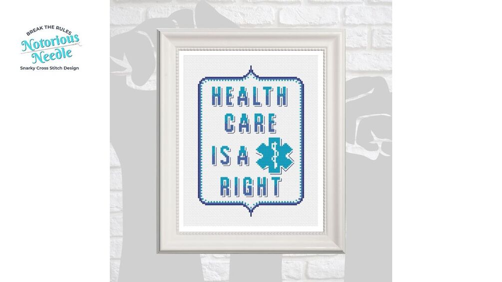 “Healthcare is a Right” is stitched in bold, blue lettering combined with the symbol for Emergency Medical Services. This symbol, called the “Star of Life”, includes the staff of Asclepius – a god of medicine in ancient Greece.