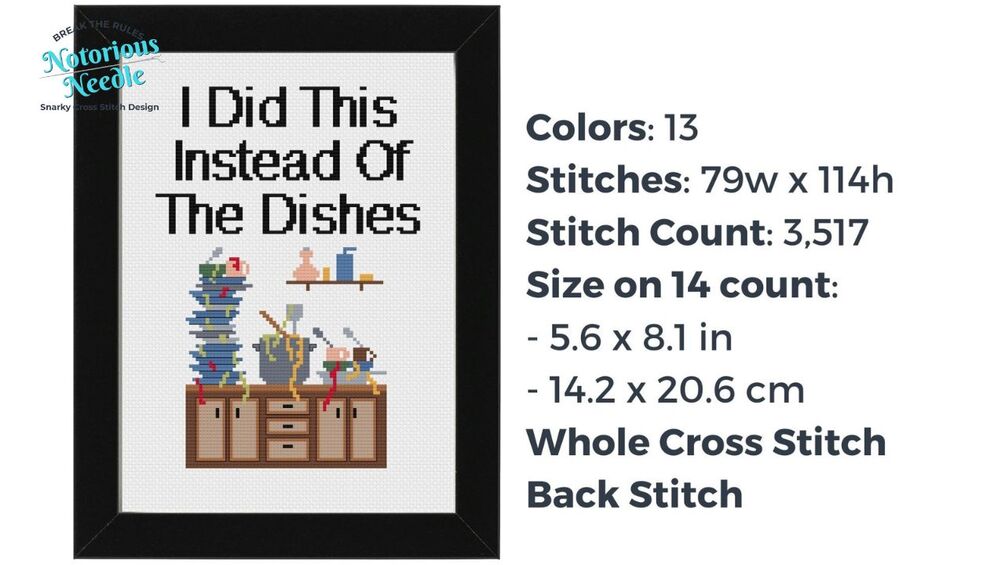 Procraftinate! You know you’d rather cross stitch this than do the dishes. Me, too. 🙂 Make it official! This pattern features a simple black font with a heaping pile of dirty dishes on top of a kitchen counter.