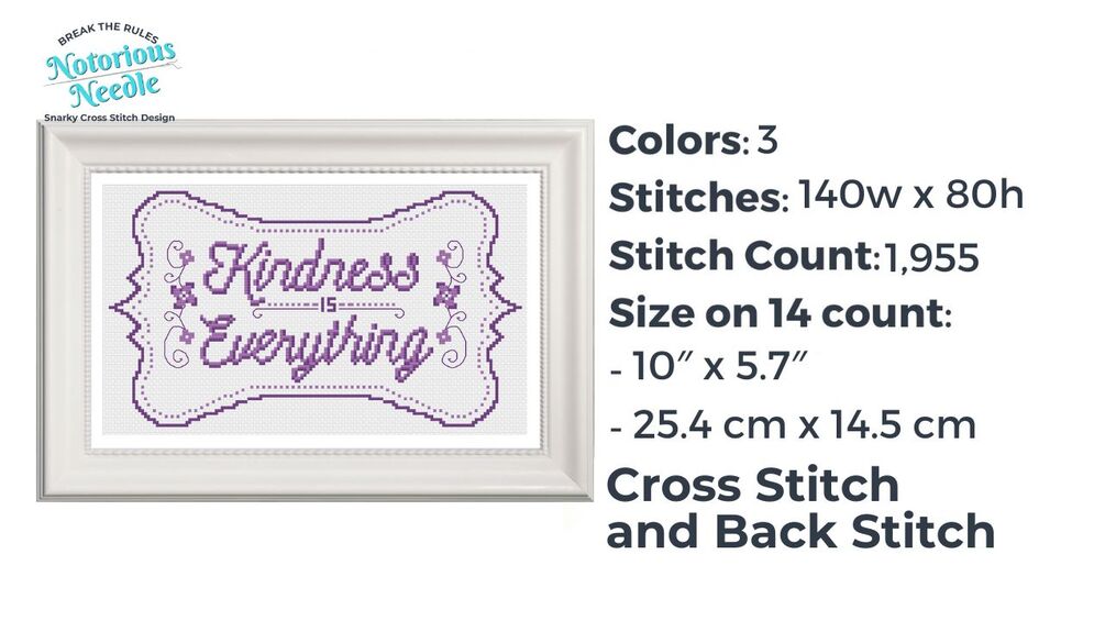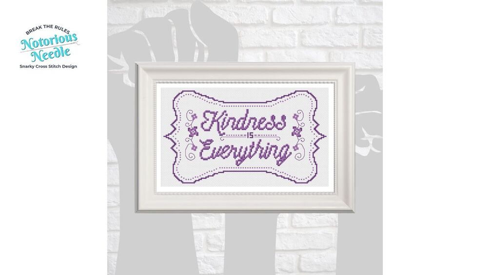 The phrase “Kindness is Everything” is featured in a script-style alphabet in lovely lavender, framed in flowers and curly back stitched vines. But you can skip the back stitch and it will still be graceful.