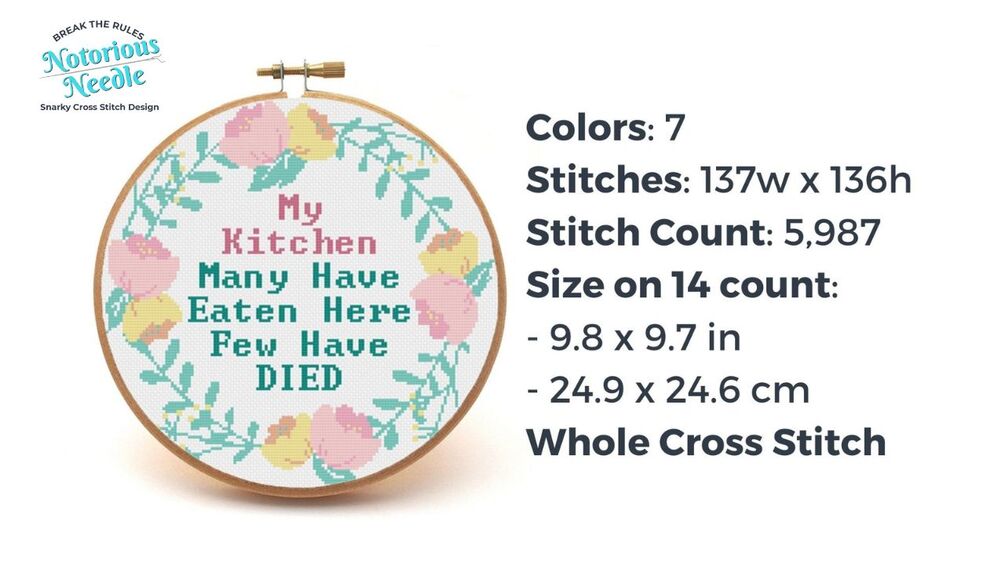 If your friends and family make fun of your terrible cooking, you need this. lol At first glance, it looks like a pretty little embroidery decoration. But examine closer and read the words, and this project will send a chilling message to your dinner guests. The dark sea green lettering matches nicely with the pink and yellow floral wreath and sea green leaves. Hang this funny cross stitch pattern in your kitchen, or stitch and gift to someone you love (or hate).