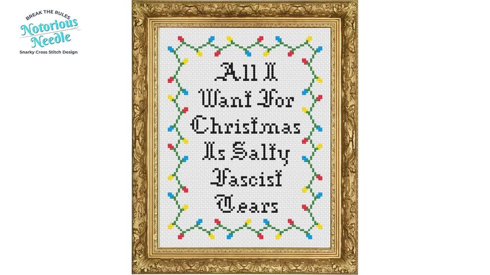 Introducing the "All I Want for Christmas is Salty Fascist Tears" Cross Stitch Pattern, a merging of holiday cheer and rebellious spirit! This bold and snarky design features the phrase stitched in an elegant Old English font, surrounded by a playful border of twinkling Christmas lights. Whether you're looking to add some edgy decor to your home or create a unique gift for someone with a sharp sense of humor, this pattern is sure to spark conversation and spread some unapologetic holiday joy.