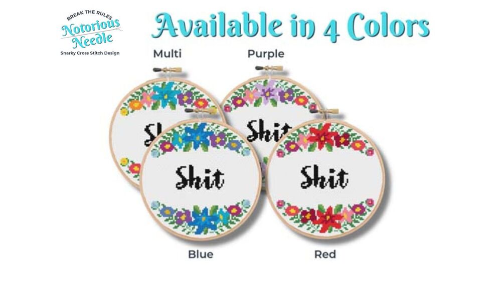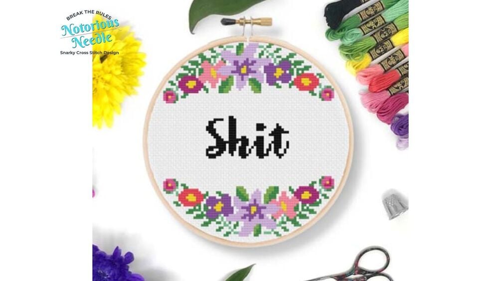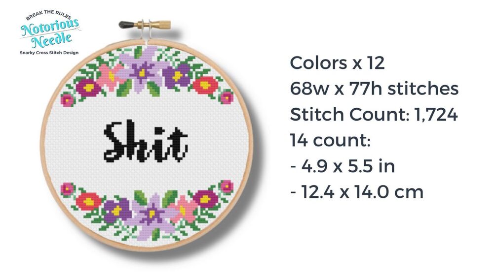 "Shit" is written in bold, black script font surrounded by a purple floral wreath cross stitch pattern PDF instant download. Fits perfectly inside a 6-inch embroidery hoop when cross stitched on 14ct fabric.