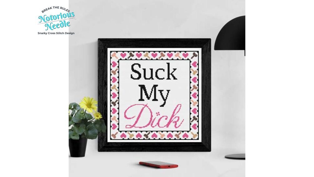 “Suck My Dick” counted cross stitch pattern featuring bold black letters, pretty pink script and an adorable border of little hearts and dicks in 4 different skin tones.